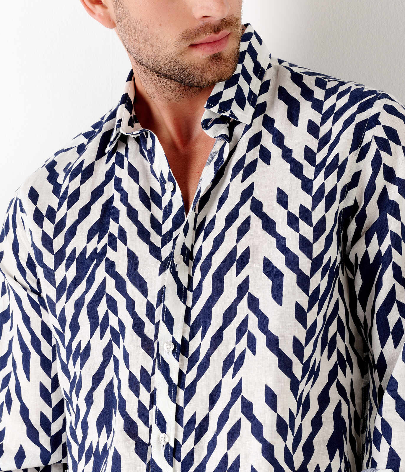 JAVIER - Camisa de linho com estampa Chevyronazul marinho